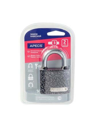 Замок навесной Apecs, МВС-123-01, PD-01-32-L, блистер, цилиндровый, с удлиненной дужкой, 3 ключа
