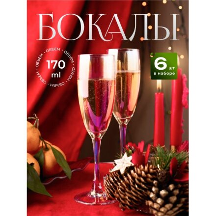 Бокал для шампанского, 170 мл, стекло, 6 шт, Glasstar, Радуга 3 Серебро, RN_1687_3