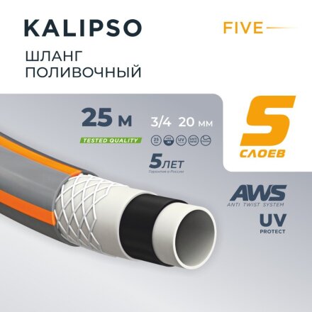 Шланг поливочный, 3/4 '', внутренний d20 мм, 21 атм, армированный, 25 м, 5 слоев, Kalipso, Five, ПВХ, антиторсионный, всесезонный, AGL263425