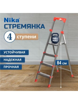 Стремянка 1 секция, 4 ступени, сталь, 1.17 м, 150 кг, с широкой ступенью, 0.84 м до платформы, Nika, ННСУ4