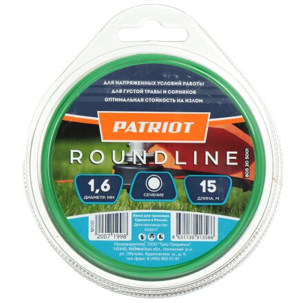 Леска для триммера 1.6 мм, 15 м, круг, Patriot, Standart/RoundLine, в ассортименте