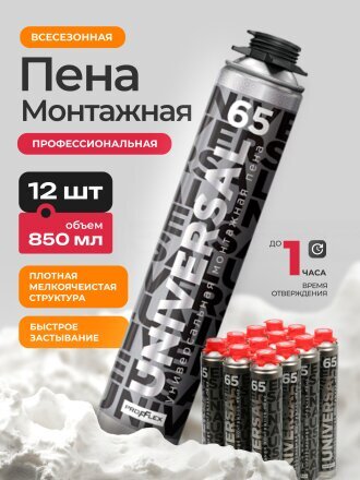 Пена монтажная Profflex, Universal, профессиональная, 65 л, 850 мл, комплект 12 штук, всесезонная, 1635