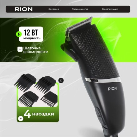 Машинка для стрижки, Rion, PR-3229, сетевая, 12 Вт, черный, хром, 4 насадки