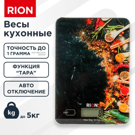 Весы кухонные электронные, стекло, Rion, Специи, точность 1 г, до 5 кг, LCD-дисплей, PT-893