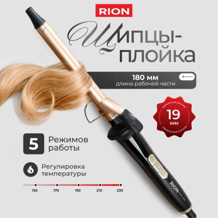 Щипцы-плойка Rion, TB-2012-19, 60 Вт, керамическое покрытие, защита от перегрева, 150-230 ℃, черный с пудровым
