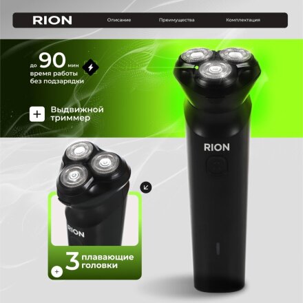 Электробритва аккумуляторная, Rion, DC5V, 0.6 А.ч, 3 бритвенные головки, выдвижной триммер,1 А, USB TYPE C, черная, RSM-2168