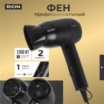 Фен дорожный, Rion, TC-2830, 1200 Вт, 1 режим, 2 скорости, черный