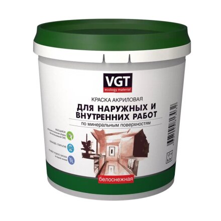 Краска водно-дисперсионная, VGT, акриловая, интерьерная, влагостойкая, матовая, белоснежная, 1.5 кг