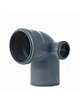 Уголок с отводом канализационный с кольцом - фасонная часть безнапорная, с раструбным присоединением, предназначена для внутренней канализации. Уголок с отводом серый канализационный, диаметр основной трубы составляет 110 мм, диаметр дополнительной трубы (выход справа) 50 мм.