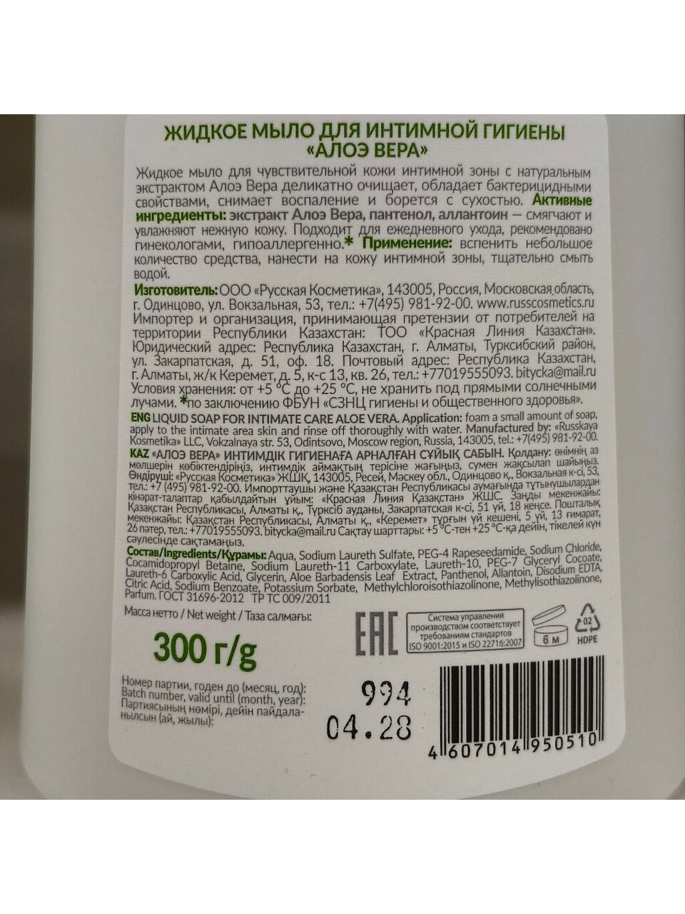 Оно нежно очищает, поддерживает естественный рН. Подходит для чувствительной кожи. Гипоаллергенно. В его состав входит сок алоэ вера богатый витаминами. Мыло бережно ухаживает за кожей и дарит ощущение комфорта.