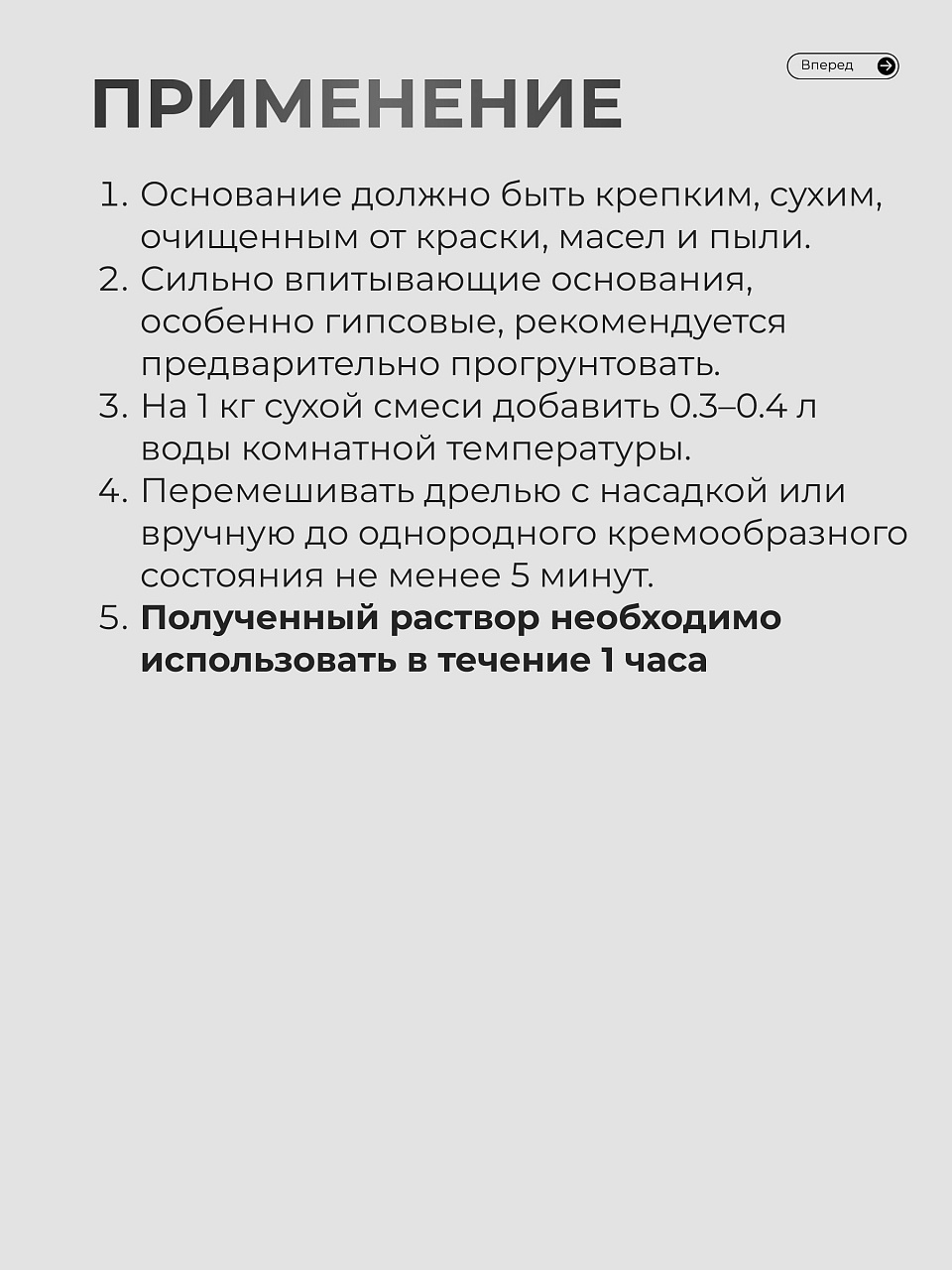 Основание должно быть крепким, сухим, очищенным от краски, масел и пыли. Сильно впитывающие основания, особенно гипсовые, рекомендуется предварительно прогрунтовать. На 1 кг сухой смеси добавить 0.3–0.4 л воды комнатной температуры. Перемешивать дрелью с насадкой или вручную до однородного кремообразного состояния не менее 5 минут. Полученный раствор необходимо использовать в течение 3 часов.