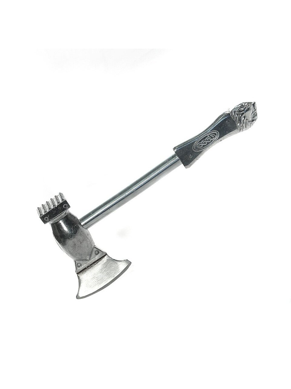 Молоток для мяса с топориком выполнен из из алюминиевого сплава. Рукоятка с красивым анималистическим изображением имеет дополнительный вес для баланса.