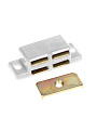 Мебельный магнит предназначен для фиксации фасада в закрытом положении. Он подходит для шкафчиков, комодов с выдвижными ящиками, тумбочек и т.д. Изделие состоит из крепежного элемента с магнитом в пластиковом корпусе и ответной металлической планки.