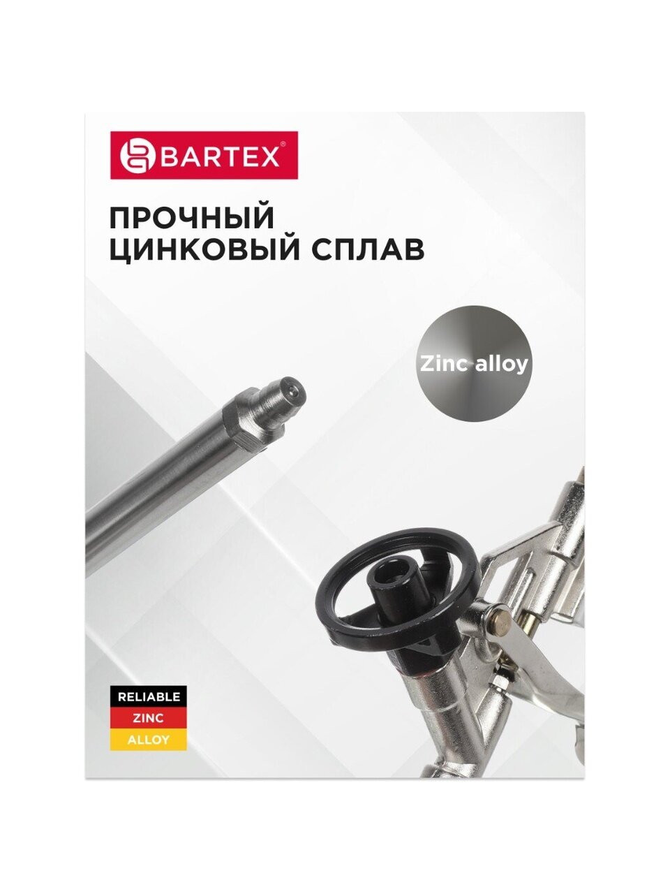 Пистолет для монтажной пены Bartex – это идеальный инструмент для быстрого, безопасного и точного заполнения щелей и пустот даже в труднодоступных местах. С помощью винта Вы сможете регулировать объем и скорость выхода пены. Эта удобная опция позволит Вам сократить время работ и избежать перерасхода материала. Эргономичная форма изделия и легкий пуск курка обеспечивают надежный и удобный захват, не давая Вашим рукам устать даже при длительной нагрузке.