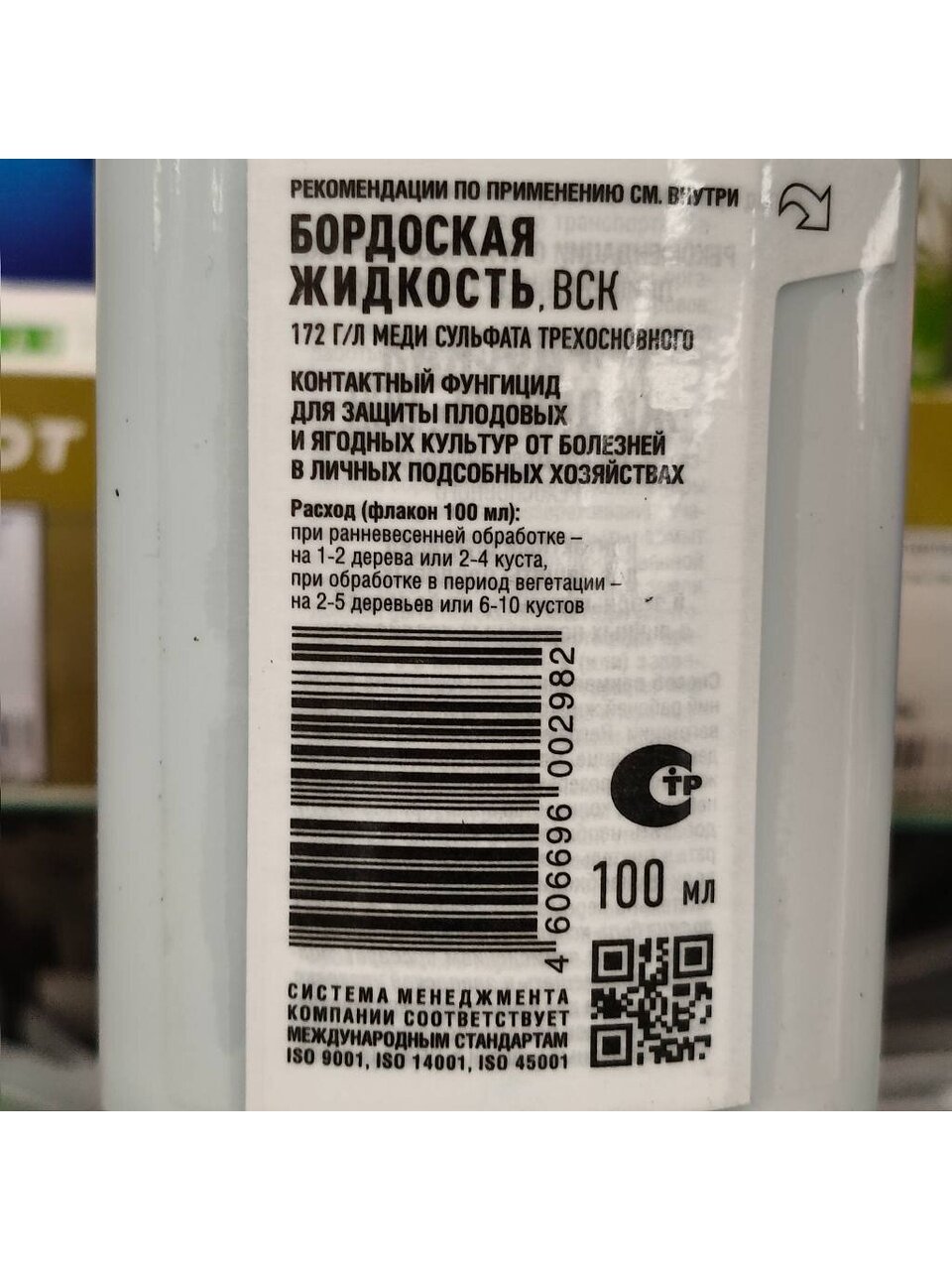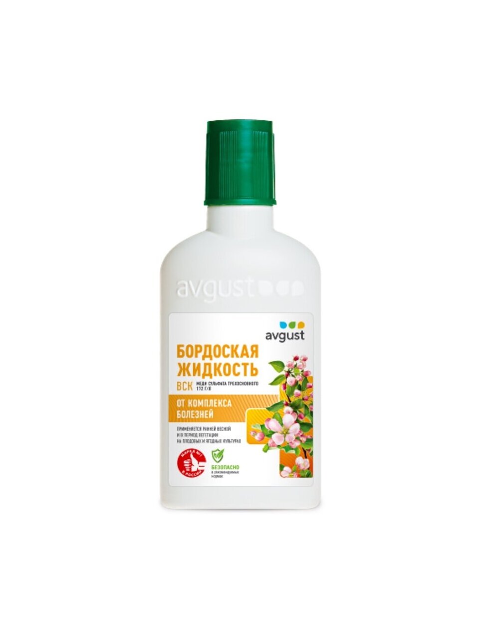 Бордоская жидкость применяется для защиты плодово-ягодных культур от грибных и ряда иных заболеваний. Препарат относится к категории контактных фунгицидов и представляет собой водно-суспензионный концентрат (ВСК) трехосновного сульфата меди. Готовая Бордоская жидкость во флаконе отличается эффективным действием и удобством применения, благодаря чему получила широкое применение в личных подсобных хозяйствах и на дачных участках.