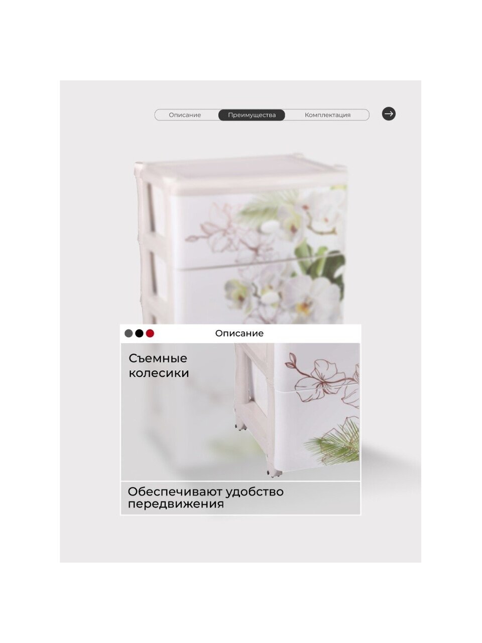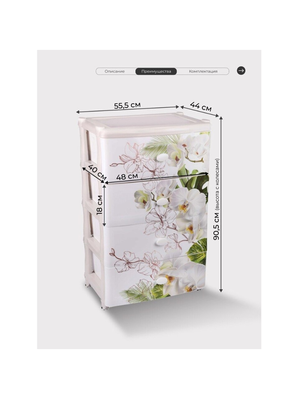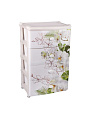 При производстве используется только сертифицированное и экологически чистое, качественное сырье отечественных и зарубежных производителей. Данное изделие произведено на современном технологичном оборудовании, а потому отличается прочностью и устойчивостью разнообразным механическим воздействиям. Также особую прочность изделию придает цельная конструкция перегородок. Оригинальный внешний вид задает изображение ярких цветов, лицевой части ящика. Комод имеет четыре широких выдвижных ящика большой вместимости, в которых будет очень удобно хранить личные вещи и другие принадлежности. Благодаря небольшому весу, комод очень легко передвигается. Комод упаковывается в индивидуальную упаковку, где каждый клиент сможет найти инструкцию по сборке.
