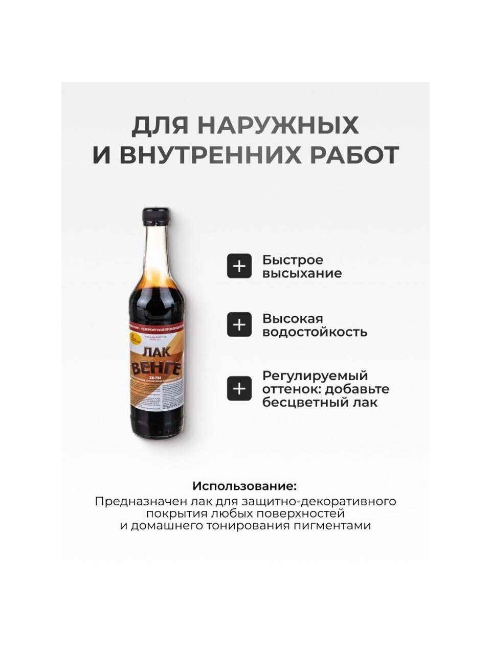 Лаки ХВ-784 предназначены для тонирования и защиты деревянных изделий, эксплуатирующихся в атмосферных условиях и внутри помещений. Придаёт благородный оттенок деревянным изделиям. Для изменения интенсивности цвета покрытия тонированный лак можно разбавлять лаком бесцветным. Если необходимо подчеркнуть текстуру древесины, рекомендуется наносить бесцветный лак на дерево, предварительно обработанное водными или неводными морилками или использовать тонированный лак.
