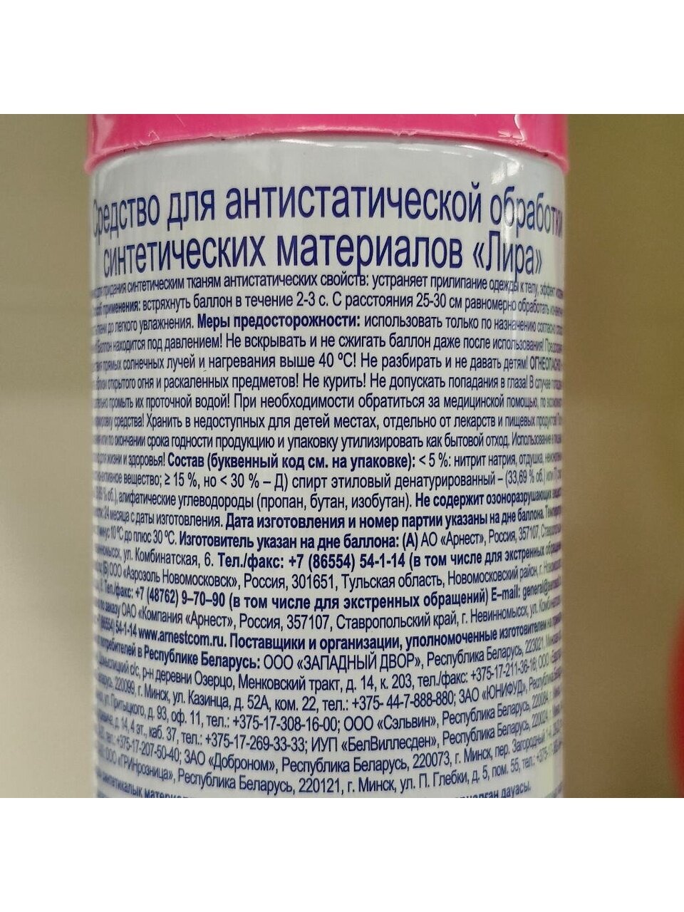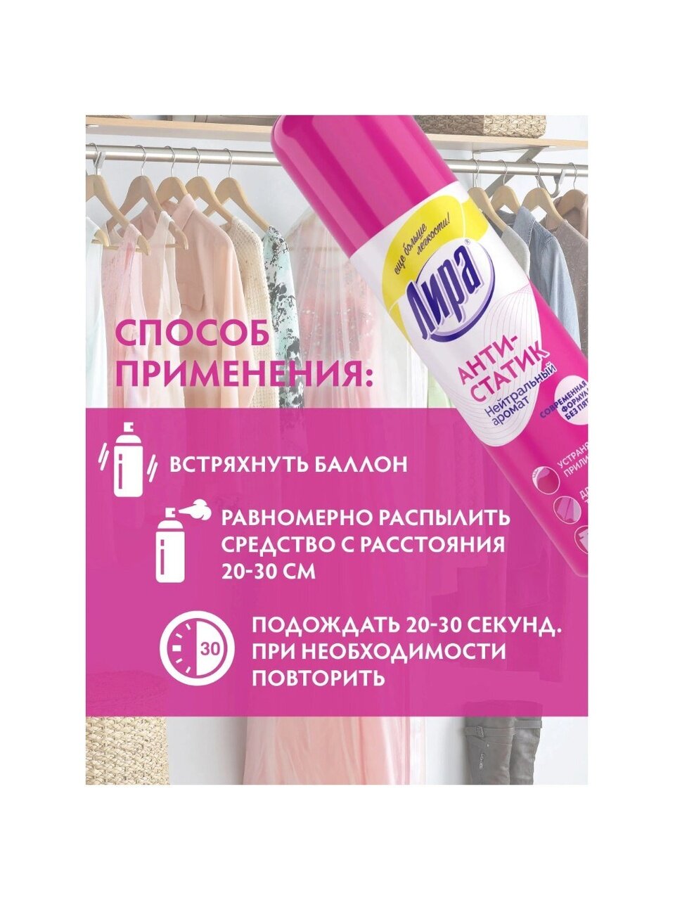 Современная формула средства Лира предназначена для антистатической обработки материалов. Устраняет прилипание одежды к телу, искрение и треск. Кондиционирующие добавки смягчают ткань и делают одежду приятной на ощупь. Дезодорирующий комплекс предотвращает появление неприятных запахов и сохраняет длительную свежесть Вашей одежды.