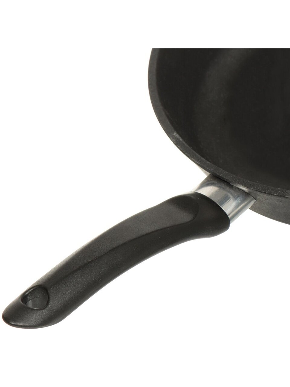 Вес сковороды — 2,4 кг, диаметр по верху — 24 см, диаметр дна — 18 см, высота борта — 40 мм. Сковорода глубокая, с толстыми стенками (3,5 мм), подходит для разных типов плит и открытого огня.