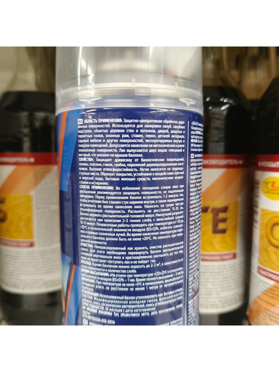Применение: Во избежание попадания следов лака при распылении рекомендуется защищать поверхности, не подлежащие лакировке. Перед применением баллон встряхивать 1-2 минуты так, чтобы отчетливо был слышен стук шариков внутри, а также периодически встряхивать во время нанесения лака. Наносить на сухую чистую отшлифованную поверхность. Распылять на расстоянии 15-35 см. Баллон держать распылительной головкой вверх. Наилучший результат достигается при нанесении 2-3 тонких слоёв, с межслойной сушкой 10-15 минут. Покрасочные работы проводить при температуре от +10 до +35ºС и относительной влажности воздуха (65±5)%, избегать сквозняков и прямых солнечных лучей. Во время нанесения температура аэрозольного баллона должна быть не ниже +20ºС. Не наносить при повышенной влажности.