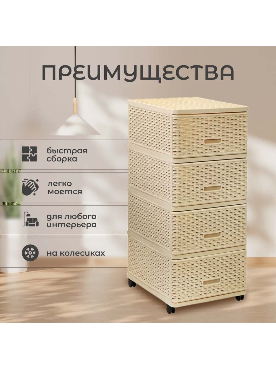 Особенности | на колесах, плетеный |