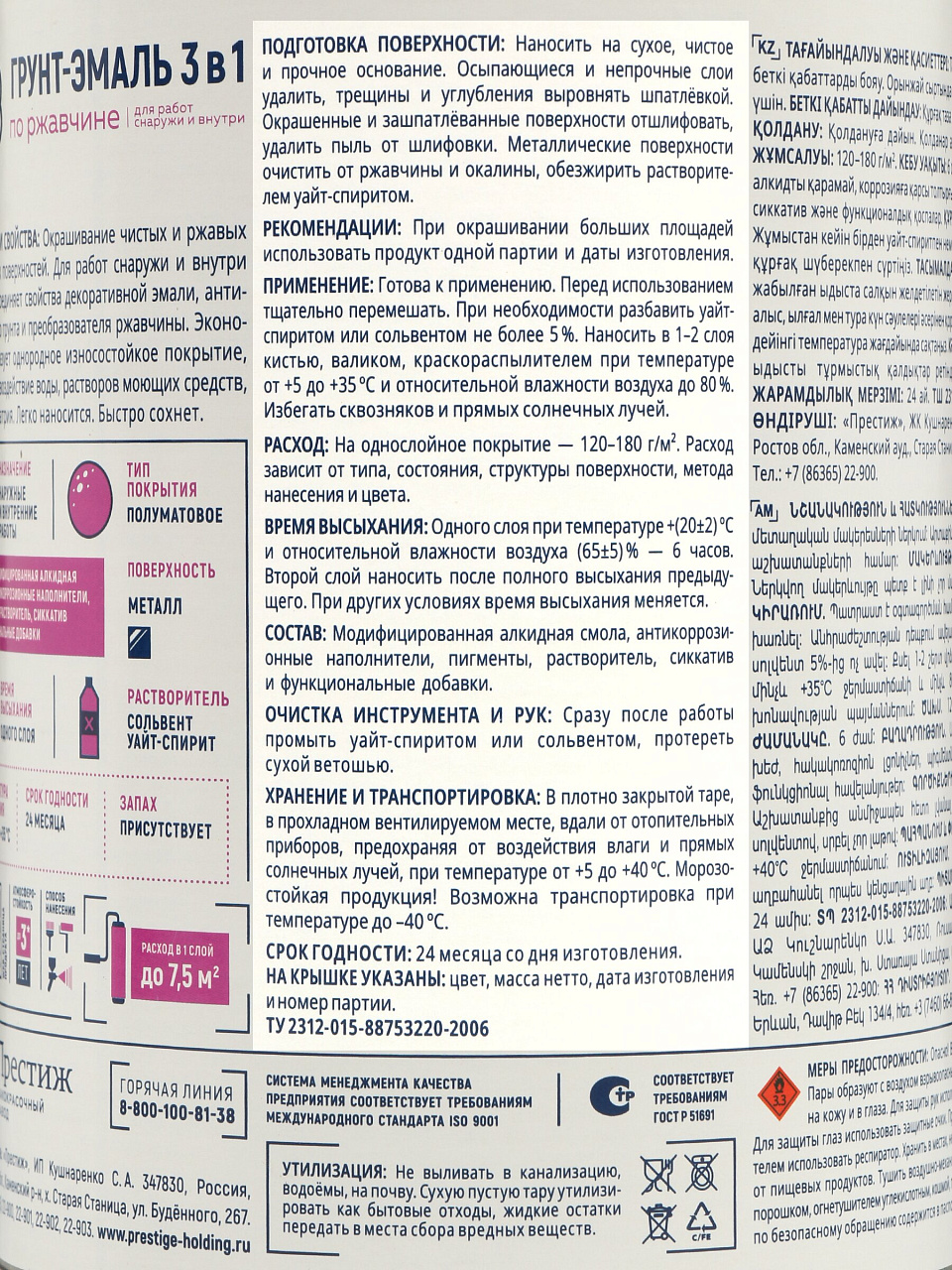 Окрашивание чистых и ржавых металлических поверхностей. Для работ снаружи и внутри помещения. Соединяет свойства декоративной эмали, антикоррозионного грунта и преобразователя ржавчины. Экономичная. Однородное износостойкое покрытие, выдерживает воздействие воды, растворов моющих средств, хлористого натрия. Легко наносится. Быстро сохнет.