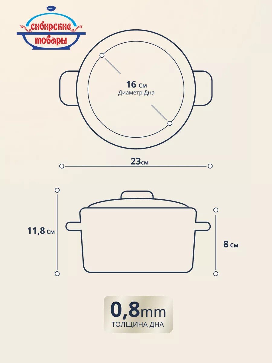 Объём — 1,5 литра, диаметр и размер крышки — 16 см, высота с крышкой — 11,8 см, без крышки — 8 см, толщина дна — 0,8 мм.
