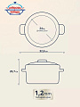 Диаметр 25 см, высота с крышкой 31,1 см, вес 2,05 кг. Толщина дна — 1,2 мм, крышка из стали в комплекте.