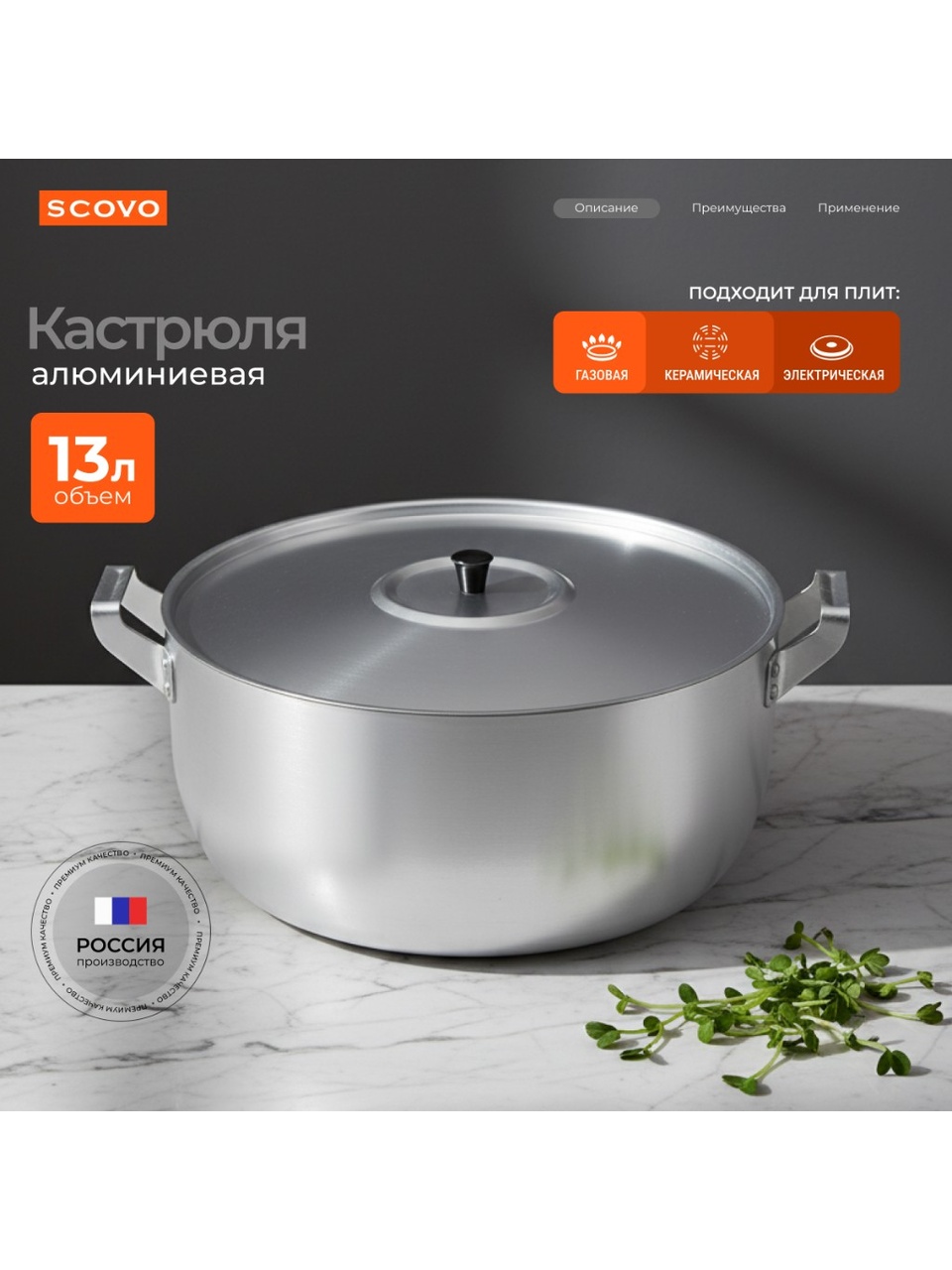 Кастрюля 13 л из алюминия Scovo МШ-019 — оптимальный выбор для больших семей и заготовок: легкая, вместительная, подходит для любых плит, легко моется.