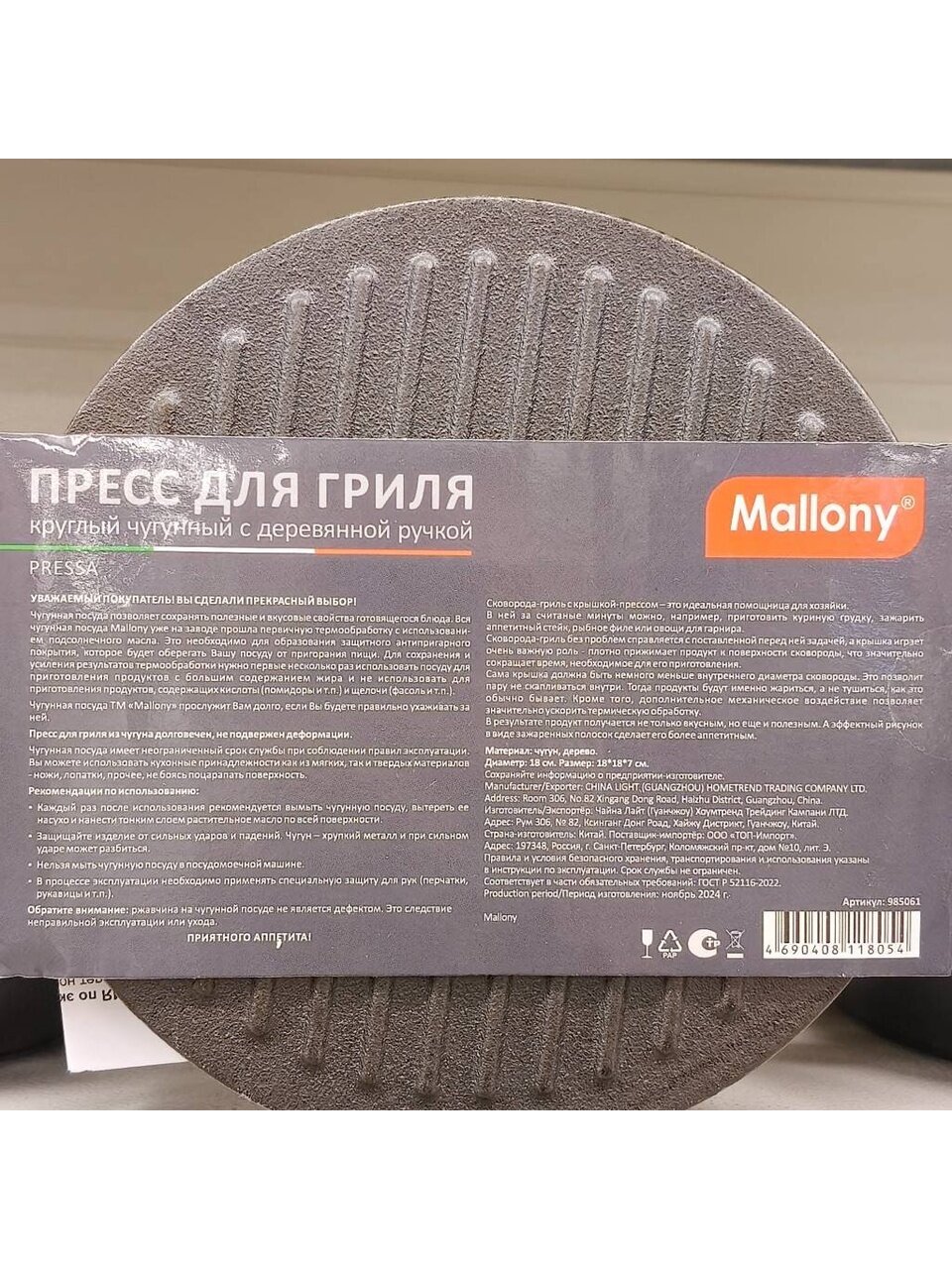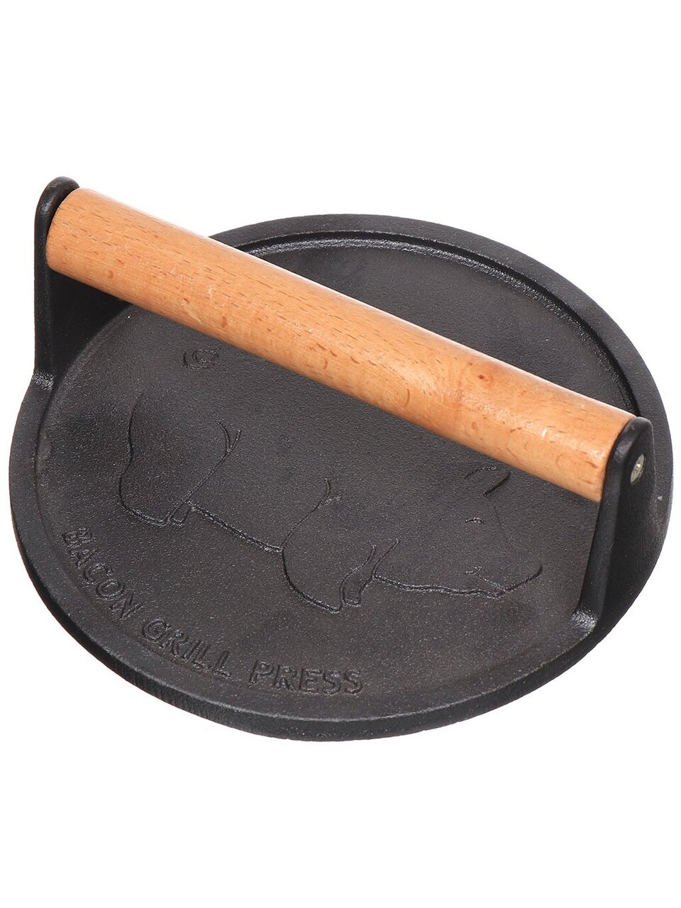 Круглый чугунный пресс для гриля незаменим на домашней кухне, за городом для барбекю. Идеален для приготовлении толстых стейков и цыпленка табака. Благодаря прессу мясное, рыбное блюдо или блюдо из птицы тщательно прожарится на сковороде или гриле, что исключит нанесение какого-либо вреда здоровью. Чугун является наилучшим материалом, который долго удерживает и равномерно распределяет тепло. Чугун обладает высокой прочностью, износоустойчивостью и антикоррозийными свойствами. Деревянная ручка не нагревается, не скользит, обеспечивает удобный хват.