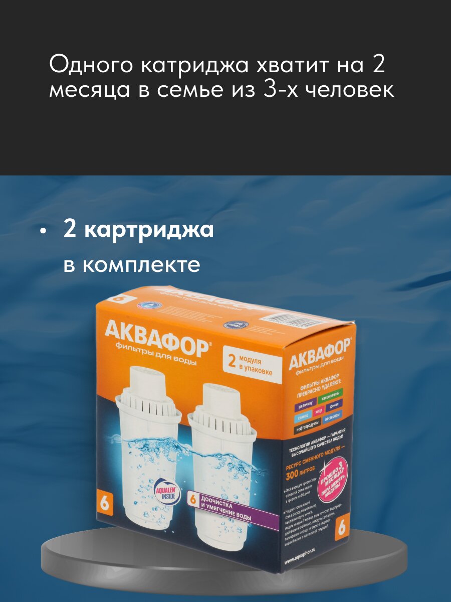 В6 (В100-6) рекомендуется для очистки воды низкой и средней жесткости (до 4 мэкв/л). Если без использования фильтра накипь появляется в чайнике через несколько дней – у вас вода высокой жесткости. Менять модули в фильтре-кувшине придётся слишком часто (раз в 2 недели). Выгоднее использовать фильтры обратного осмоса, которые помогут полностью устранить накипь (модули меняются раз в полгода и раз в год.