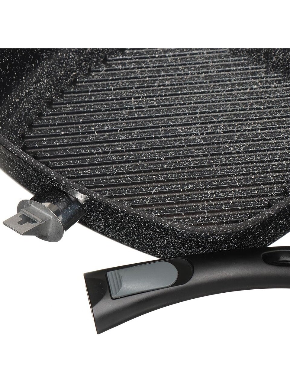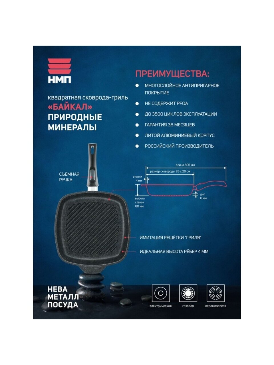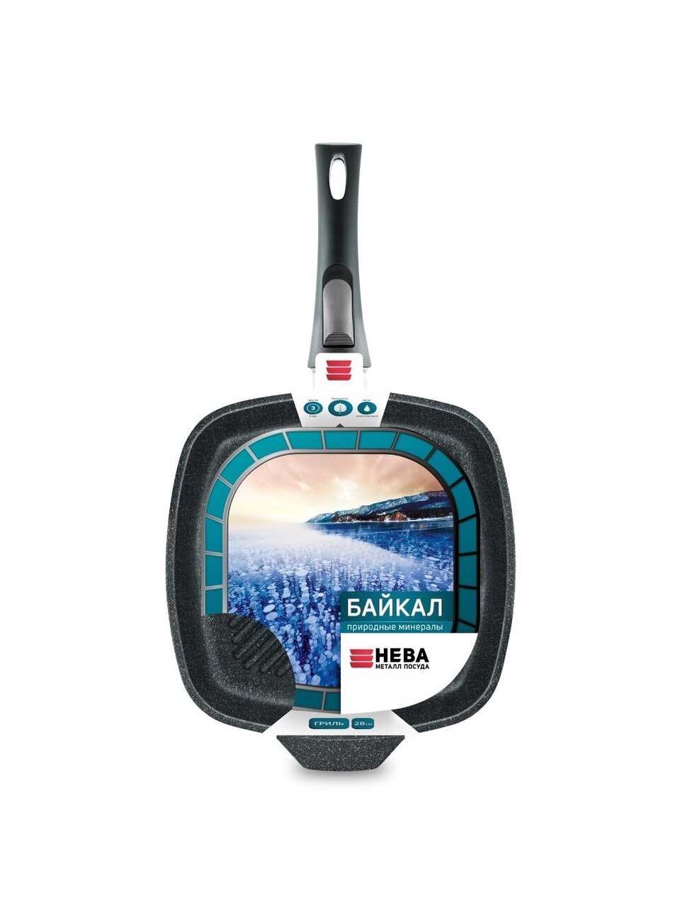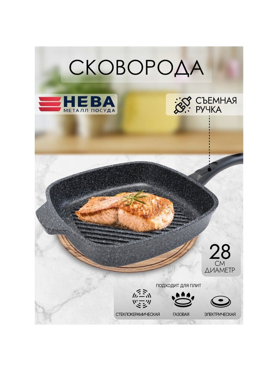 Сковорода-гриль 28 см Нева Металл Посуда Байкал — мощный литой алюминий, антипригарное покрытие, съемная ручка для удобства и долговечности.