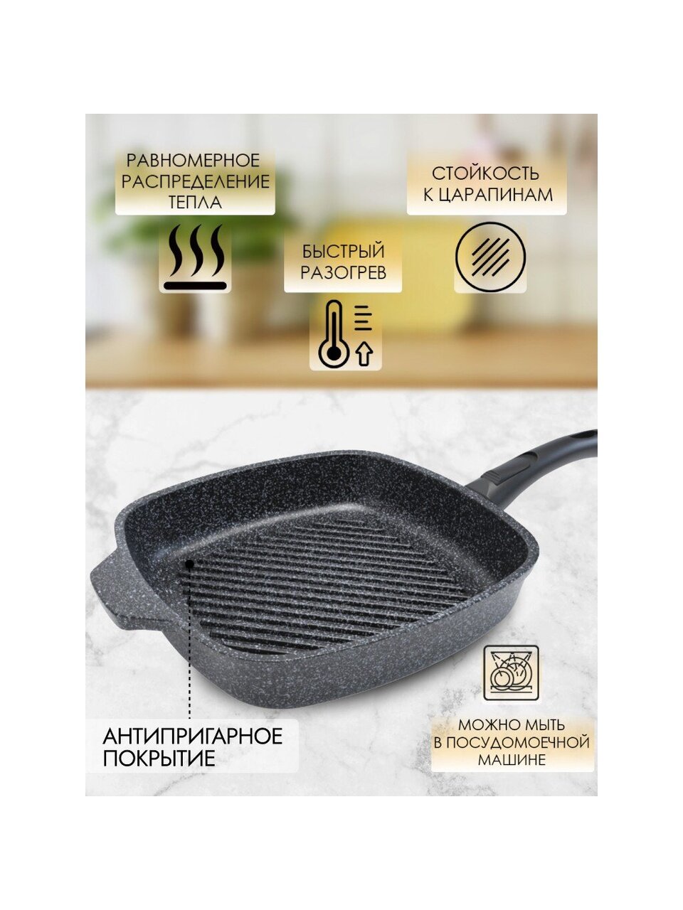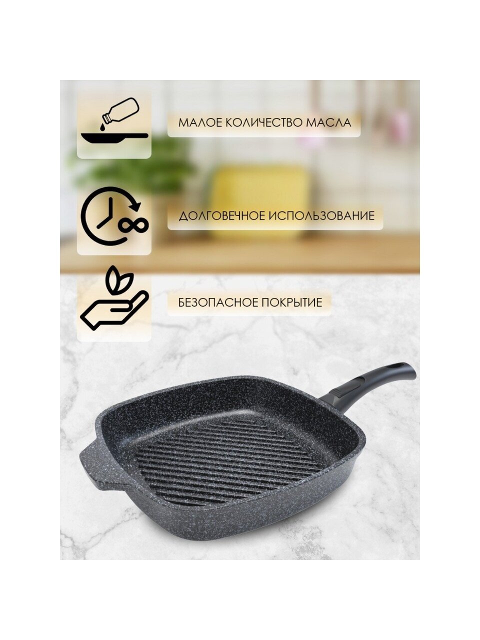 Как выбрать сковороду-гриль для дома или дачи? Байкал 28 см подойдет для газовых, электрических, стеклокерамических плит, а также для духовки. Тефлоновое покрытие облегчает уход — можно мыть в посудомоечной машине. В отличие от обычных тонкостенных моделей, литой алюминий толщиной 4 мм и дно 6 мм обеспечивают долговечность и отсутствие деформации даже при интенсивном использовании. Сковорода не подходит для индукционных плит — это важно учитывать при покупке.