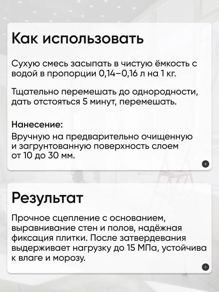 Пропорции замеса: 0.13-0.16 л/кг (3.25-4.0 л/25 кг).