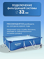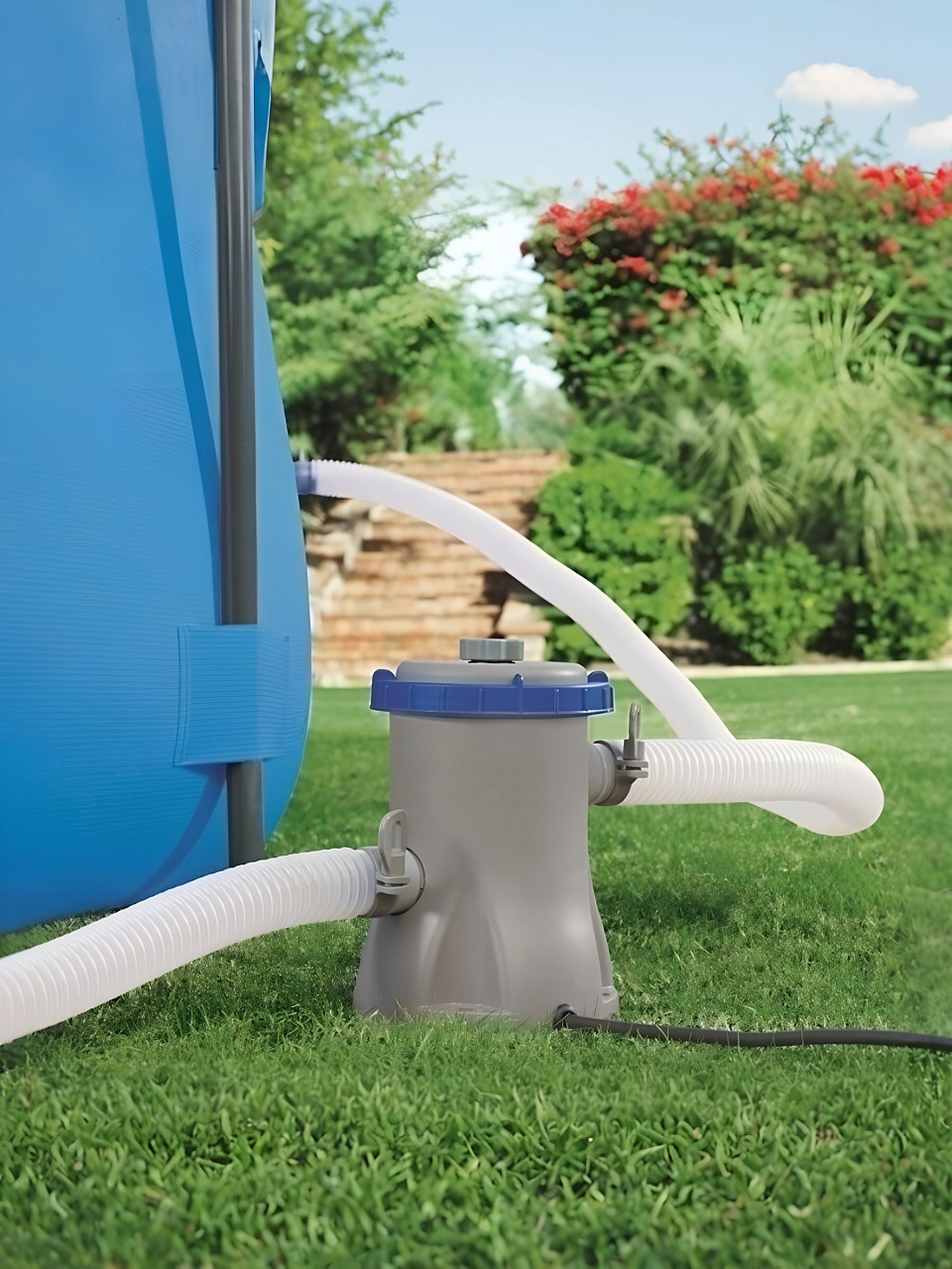 Бассейн изготовлен из трехслойного ПВХ, который обеспечивает высокую прочность и устойчивость к повреждениям. Стальной каркас добавляет дополнительную надежность конструкции, гарантируя долговечность и стабильность бассейна. В комплекте идет фильтр-насос с производительностью 1249 л/ч, который поддерживает чистоту воды, обеспечивая комфортное купание. Внутренняя отделка небесно-голубого цвета.