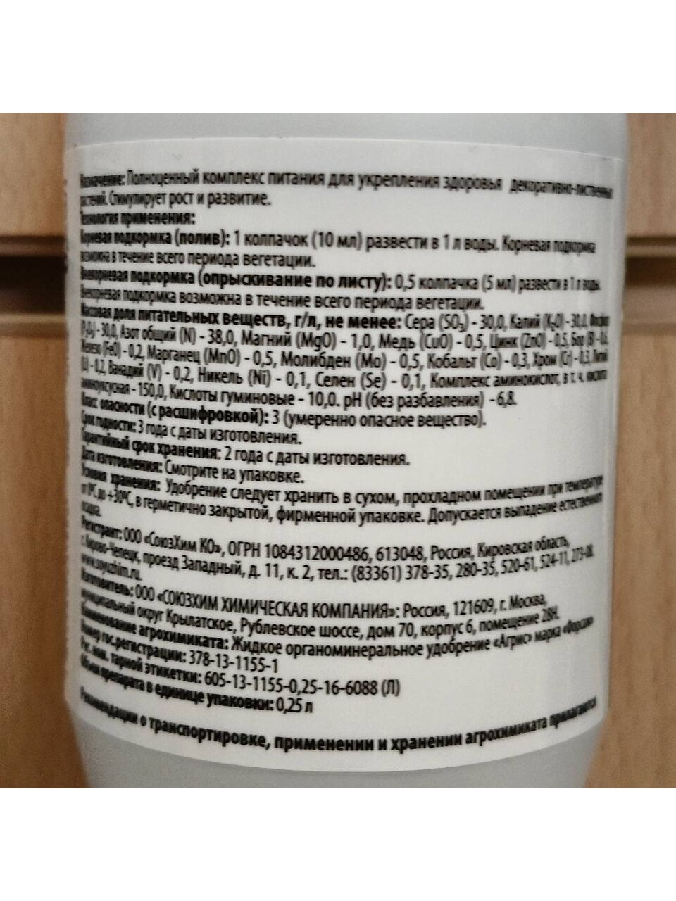 Содержание, г/л: Комплекс аминокислот, в т. ч. кислота аминоуксусная-150,00, Сера (SO3)-30,0, Калий (K2O)-30,0, Фосфор (P2O5)-30,0, Азот общий (N)-38,0, Кислоты гуминовые-10,0, Магний (MgO)-1,0, Медь (CuO)-0,5, Цинк (ZnO)-0,5, Бор (B)-0,6, Железо (FeO)-0,2, Марганец (MnO)-0,2, Молибден (Mo)-0,5, Кобальт (Co)-0,3, Хром (Cr)-0,3, Литий (Li)-0,2, Ванадий (V)-0,2, Никель (Ni)-0,1, Селен (Se)-0,1, pH (без разбавления) – 6,8