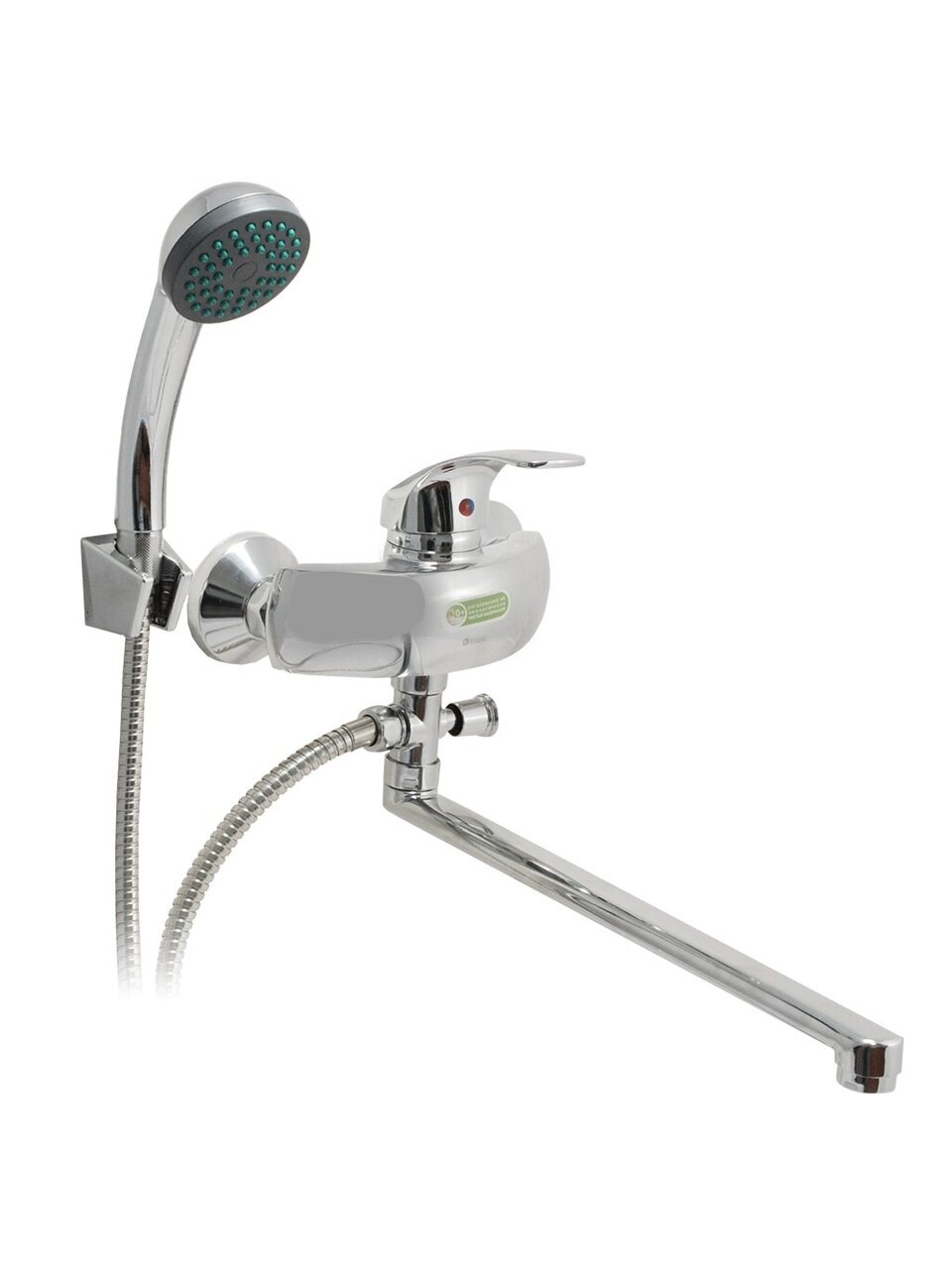 Длина излива — 28 см, корпус — силумин с глянцевым хромом, монтаж — 2 отверстия, комплектация — лейка, аэратор, жесткая подводка, защита от излома.