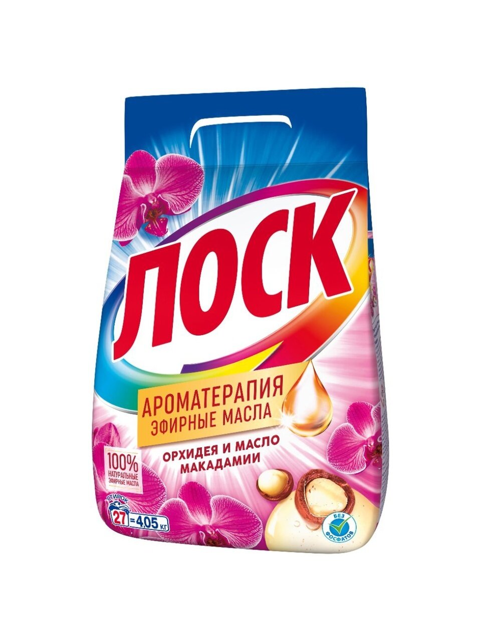 Стиральные порошки Лоск Ароматерапия Орхидея и Масло Макадамии – последнее поколение средств для стирки Лоск, которые подходят для стирки белых и цветных вещей.