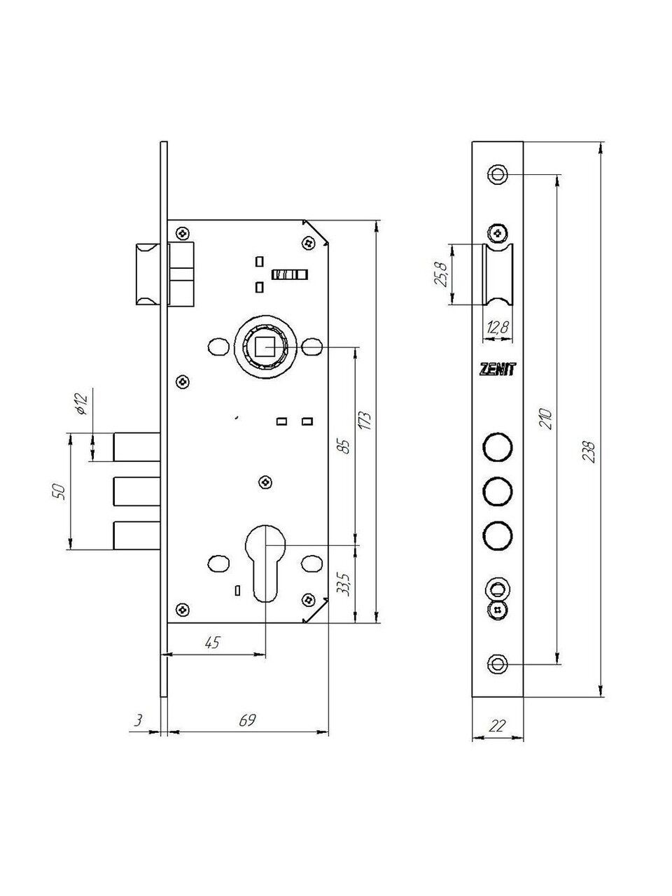 Замок врезной Зенит ЗВ4-85 цилиндрового типа предназначен для запирания левосторонних и правосторонних дверных полотен, открывающихся как внутрь, так и наружу. По посадочным размерам совпадает с замками Апекс 22 серии, Аллюр, Фуаро и другими замками китайского производства с межосевым расстоянием 85 мм. Замок рекомендуется устанавливать на наружные деревянные двери квартир и общественных зданий, толщина которых 40-45 мм, также возможен монтаж на металлические двери. Количество кодовых комбинаций цилиндрого механизма МЦ1-6 составляет 15.000 вариантов ключа. Замок врезной Зенит ЗВ4-85 цилиндрового типа сертифицирован по ГОСТ 5089 - замку присвоен 2 класс. Защелка дверного замка универсальная - смена стороны открывания происходит при вскрытии корпуса. Замок комплектуется фалевыми ручками с накладками типа РФ1-1-85. Дверные ручки крепятся между собой стяжными винтами.