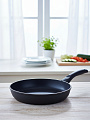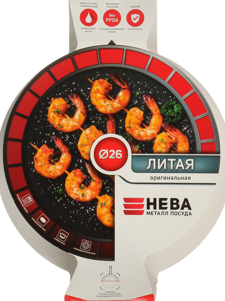 Диаметр 26 см, низкие бортики, оригинальное антипригарное покрытие — пища не пригорает, легко отмывается без усилий.