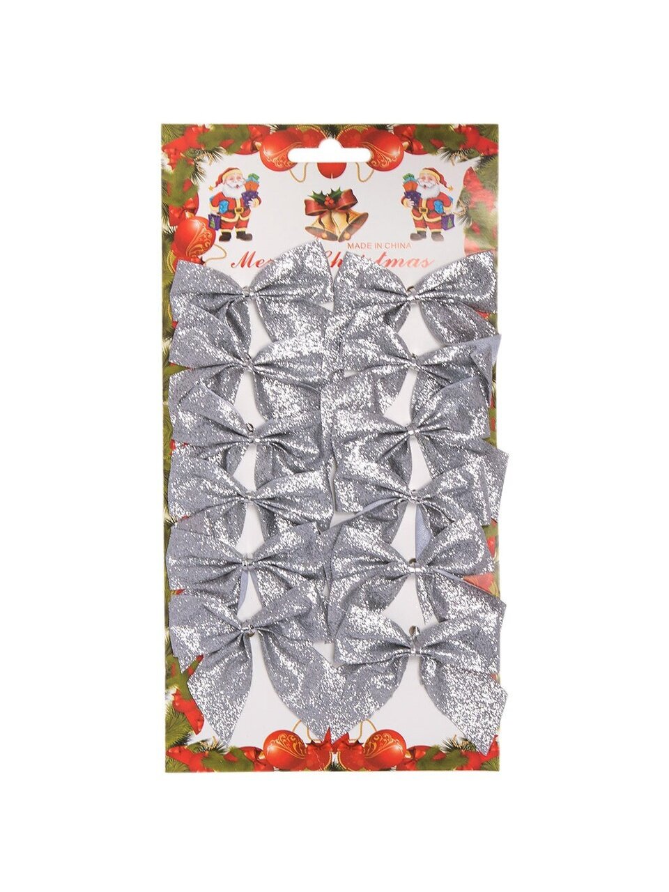 В наборе 12 серебристых бантов размером 6х6,5 см, материал — текстиль с блестками, тип крепления — на завязках, высота 6,5–7 см.
