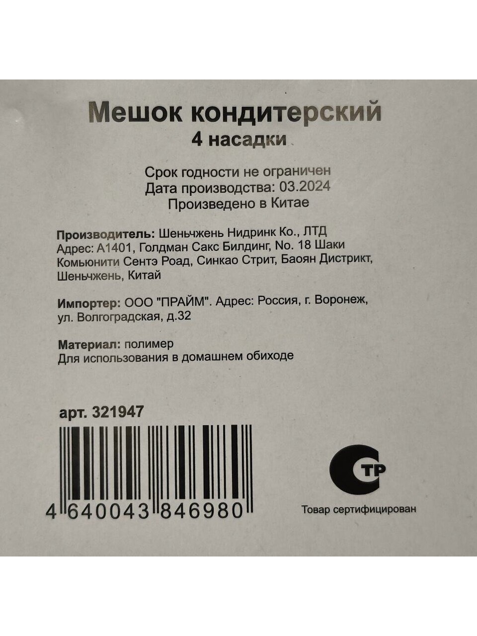 В наборе: кондитерский мешок, адаптер, 4 насадки.