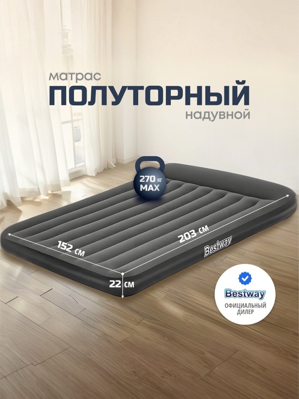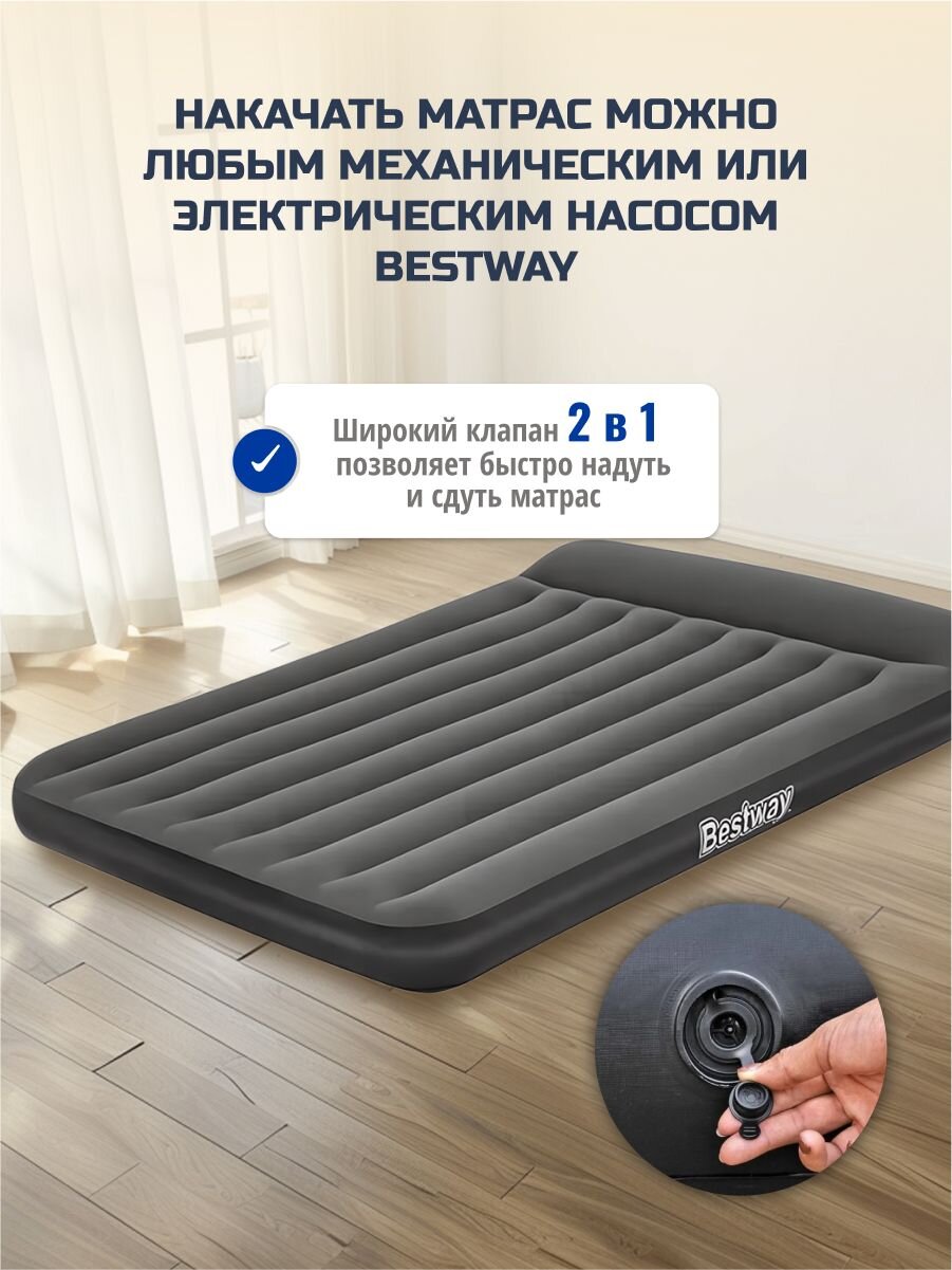 Матрас Bestway, выполненный из прочного флокированного винила, обеспечивает комфортный и здоровый сон в любых условиях. Его уникальная конструкция позволяет ему сохранять форму даже при неравномерном распределении нагрузки. Этот матрас легко надувать и сдувать, что делает его прекрасным выбором для путешествий или отдыха на природе. Кроме того, он может служить дополнительным спальным местом в квартире или доме. Если пространство ограничено, надувные матрасы становятся отличным решением для размещения гостей. Всё, что нужно сделать, - это надуть матрас и разместить его в свободной комнате.