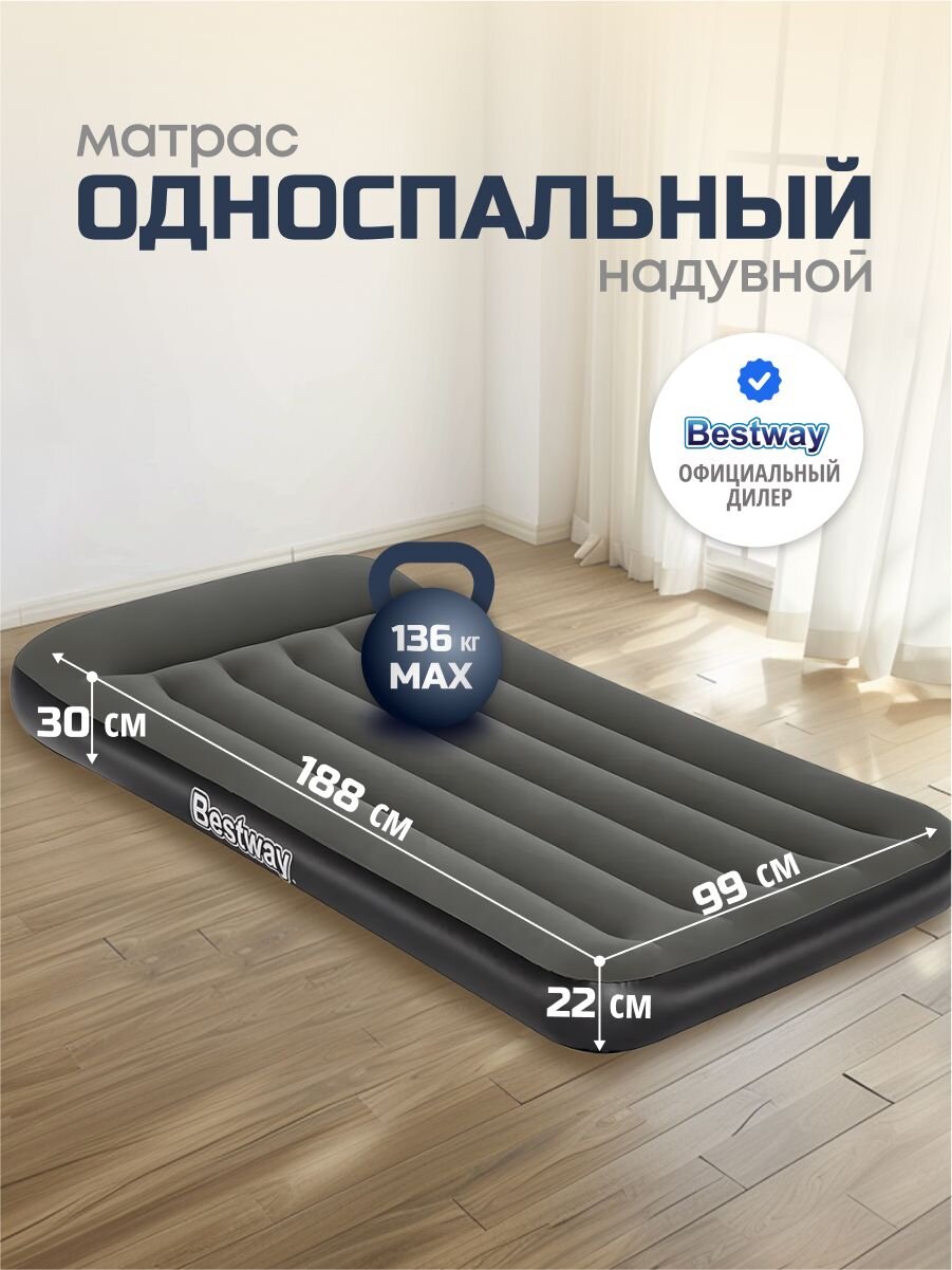 Матрас Bestway, выполненный из прочного флокированного винила, обеспечивает комфортный и здоровый сон в любых условиях. Его уникальная конструкция позволяет ему сохранять форму даже при неравномерном распределении нагрузки. Этот матрас легко надувать и сдувать, что делает его прекрасным выбором для путешествий или отдыха на природе. Кроме того, он может служить дополнительным спальным местом в квартире или доме. Если пространство ограничено, надувные матрасы становятся отличным решением для размещения гостей. Всё, что нужно сделать, - это надуть матрас и разместить его в свободной комнате.