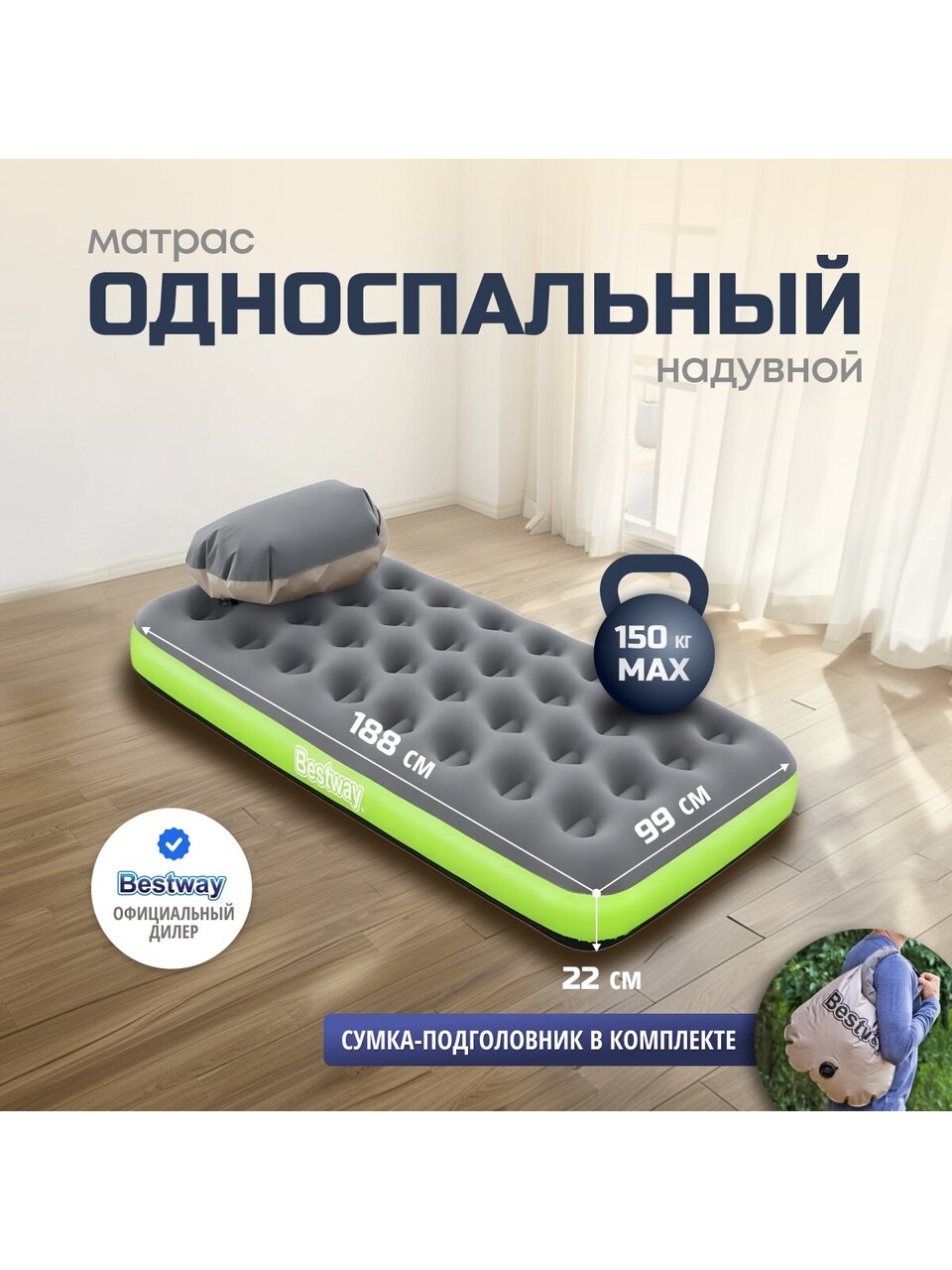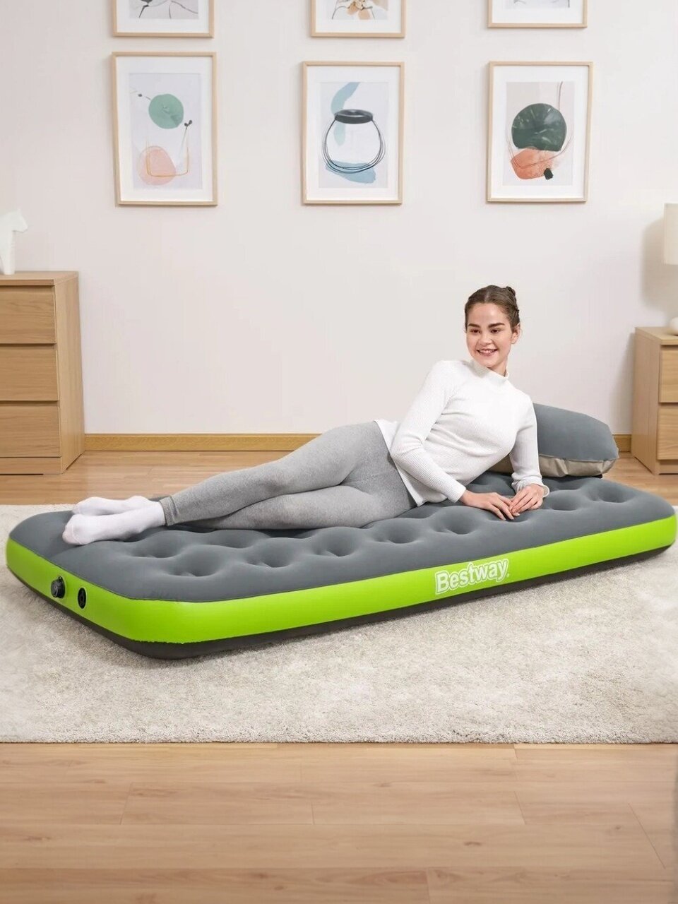 Матрас Bestway, выполненный из прочного флокированного винила, обеспечивает комфортный и здоровый сон в любых условиях. Его уникальная конструкция позволяет ему сохранять форму даже при неравномерном распределении нагрузки. Этот матрас легко надувать и сдувать, что делает его прекрасным выбором для путешествий или отдыха на природе. Кроме того, он может служить дополнительным спальным местом в квартире или доме. Если пространство ограничено, надувные матрасы становятся отличным решением для размещения гостей. Всё, что нужно сделать, - это надуть матрас и разместить его в свободной комнате.