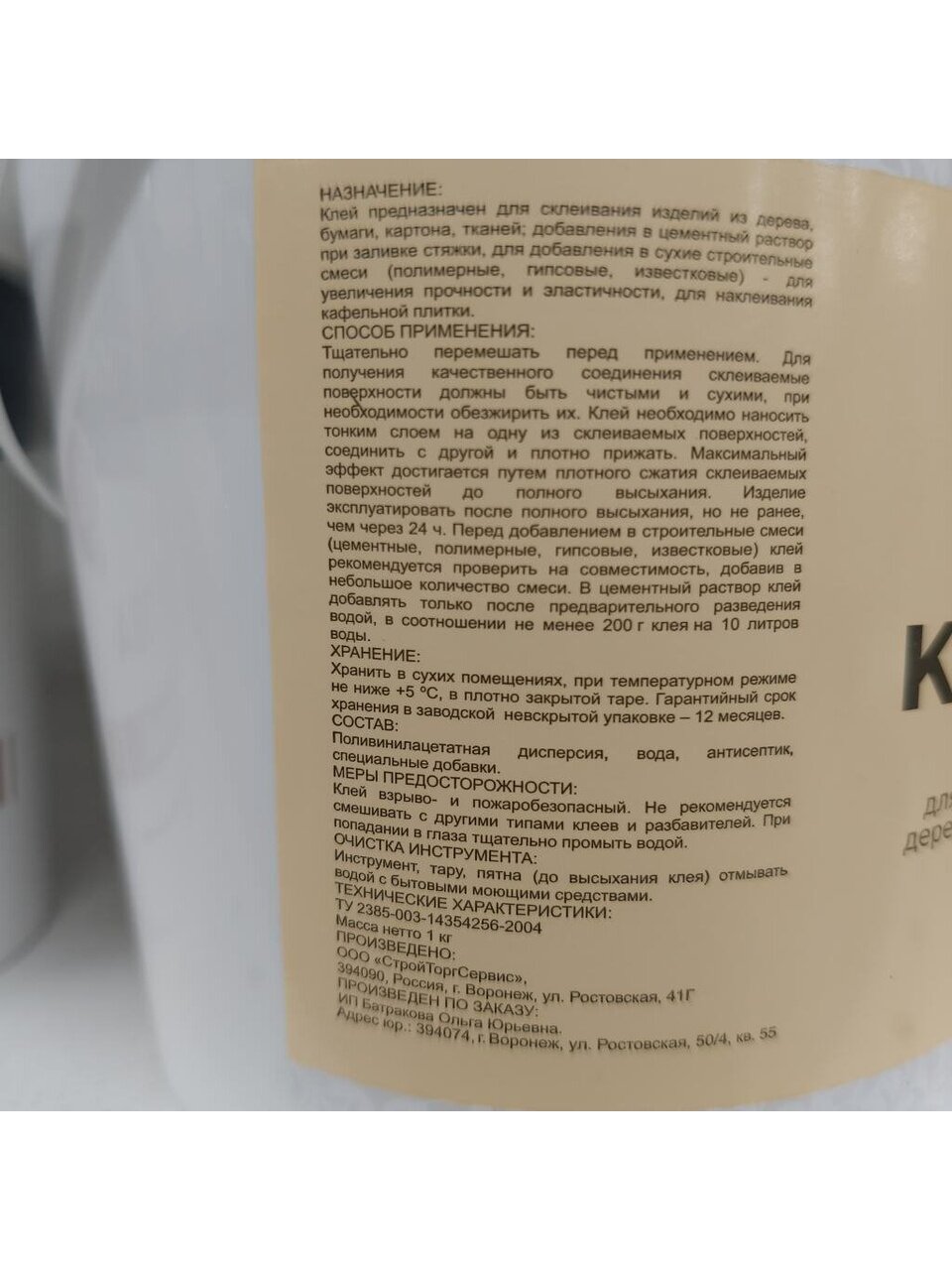 Назначение: Клей предназначен для склеивания изделий из дерева, бумаги, картона, тканей; добавления в цементный раствор при заливке стяжки, для добавления в сухие строительные смеси (полимерные, гипсовые, известковые) - для увеличения прочности и эластичности, для наклеивания кафельной плитки. Время полного высыхания 24 ч.