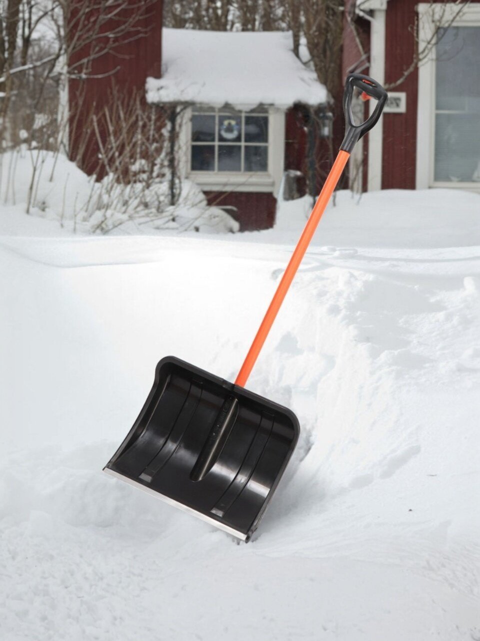 Оптимальный вариант — ковш 500х375 мм и общая длина 1375 мм. Такой размер удобен для расчистки дорожек, двора и парковки, не нагружая спину.