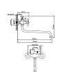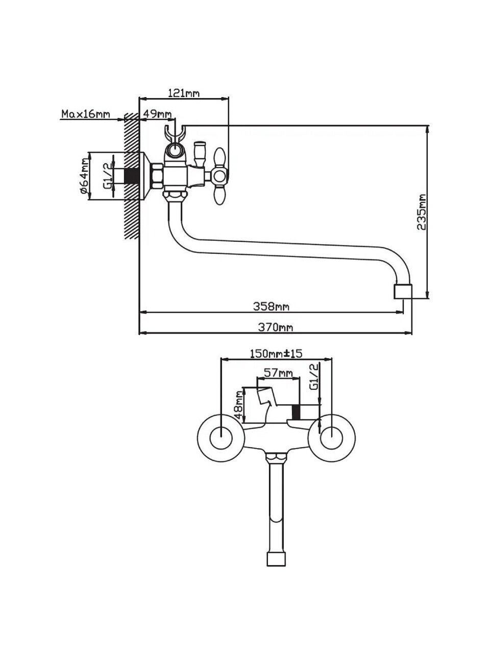 Смеситель устанавливается вертикально на стену с помощью двух отверстий, стандартное межосевое расстояние — 150 мм, крепление гайкой.