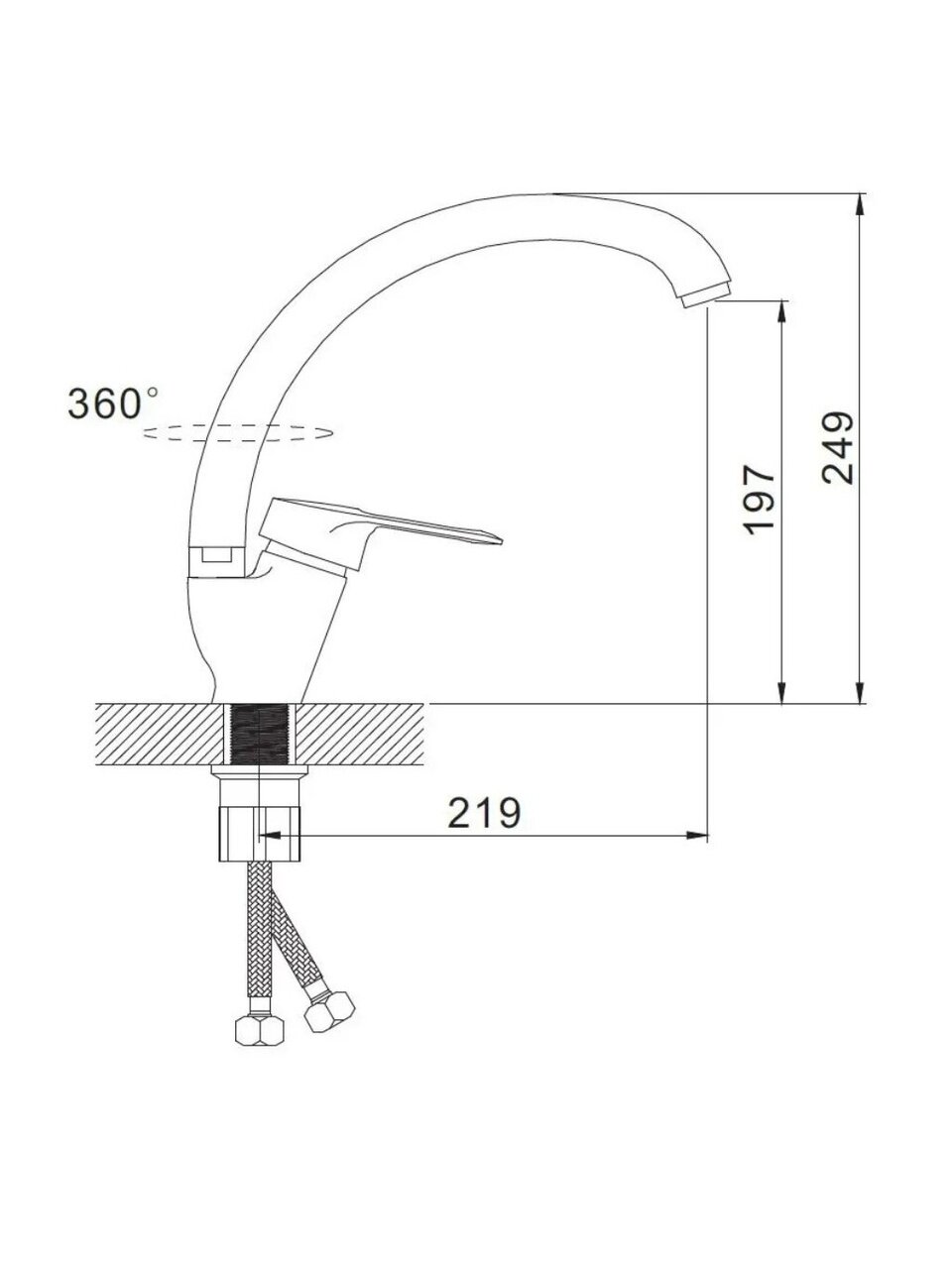 Высота излива — 19,7 см, длина — 21,9 см, монтаж в одно отверстие диаметром 35 мм, крепление на гайку, стандарт подключения шлангов — 1/2".