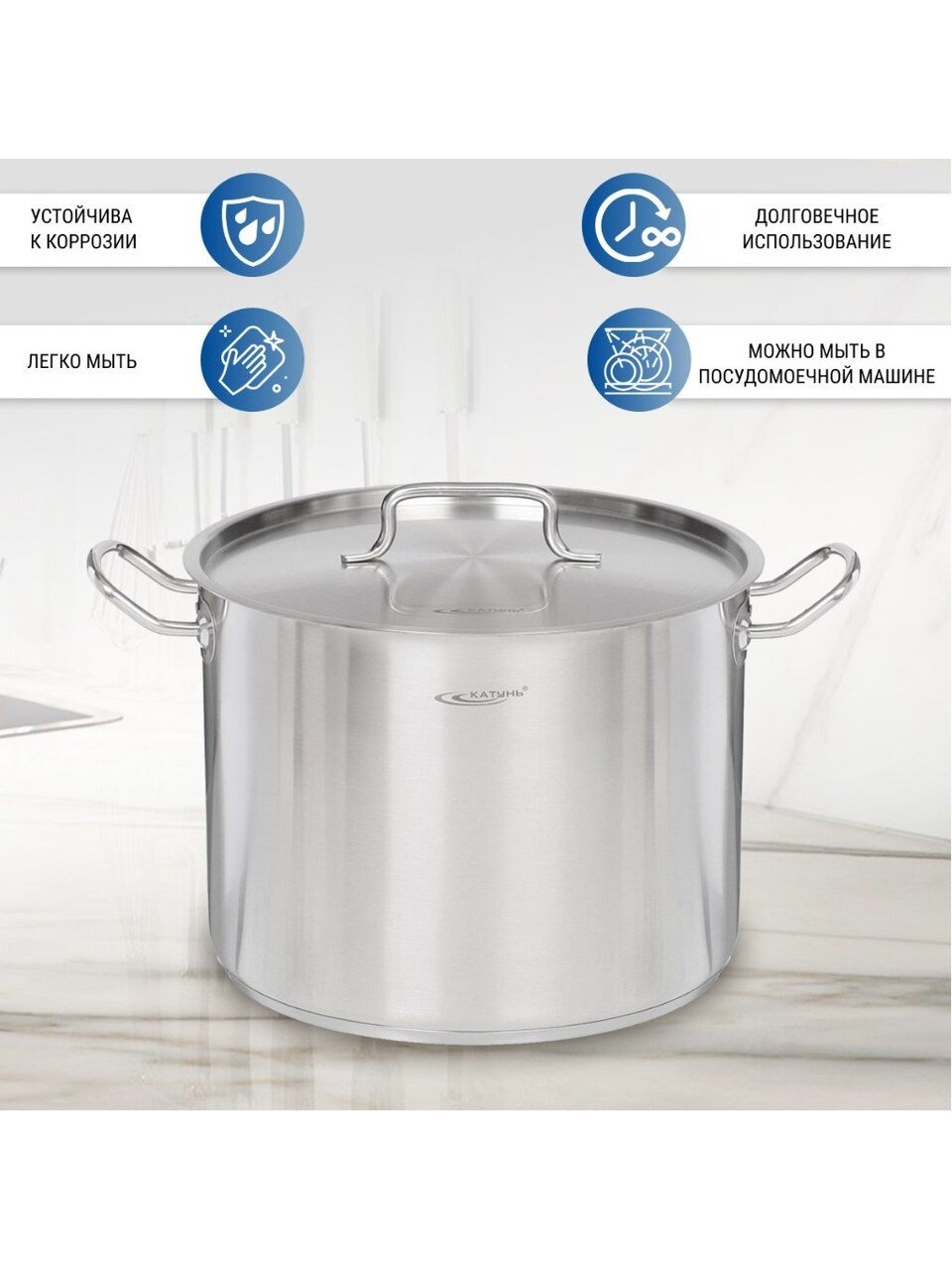 Кастрюля 13 л из нержавеющей стали Катунь Общепит — оптимальный выбор для больших семей, кафе и дачи: прочная, вместительная, с капсульным дном для равномерного нагрева.